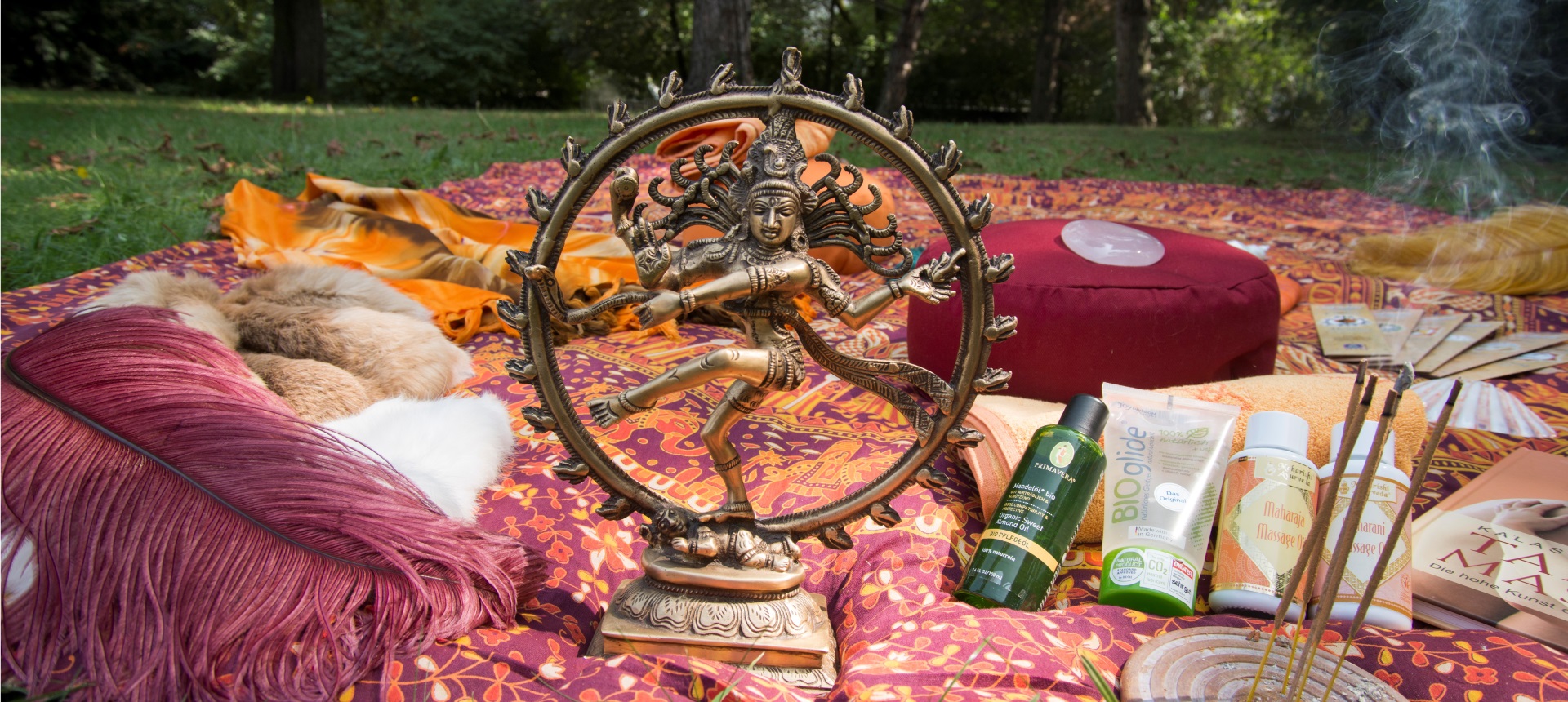 Mit Dekorationsobjekten wie tantrischen Figuren und Symbolen bekommt dein Ritualplatz einen eigenen Charakter. Für ein angenehmes Liegegefühl auf der Ritualdecke empfehlen wir dir, weiche Tücher auf die Decke zulegen.