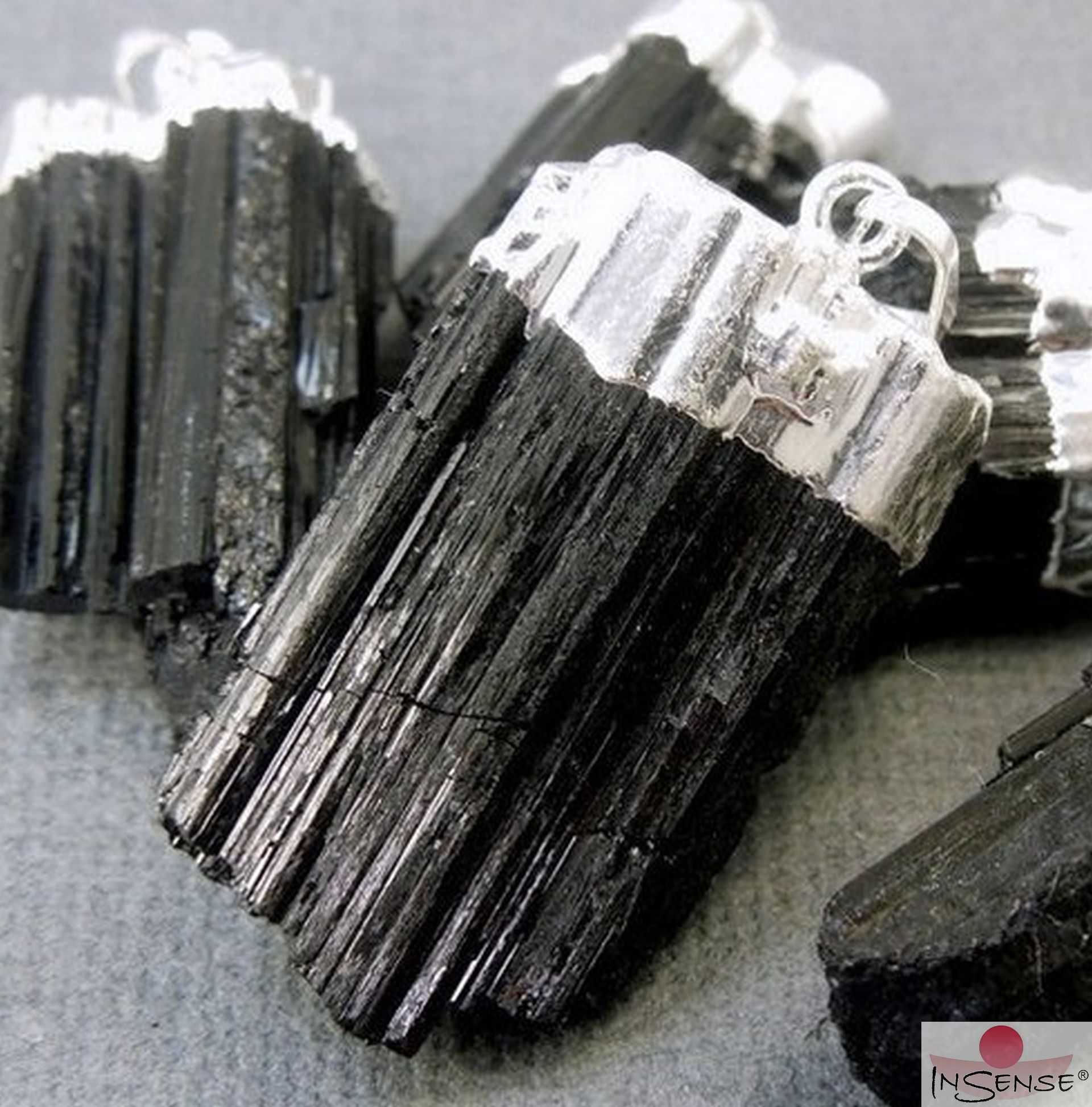 Roher, schwarzer Turmalinstab, gefasst in einer stabilen silberfarbenen Metallkappe.