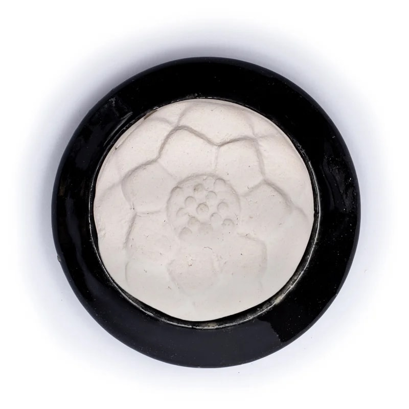 Aroma Stein Diffusor aus einer weißen, porösen Keramik mit Lotos Motiv und einem schwarzen, gebrannten Unterteil. Er wurde speziell für Räume entwickelt, in denen das verbreiten von ätherischen Ölen mit Hilfe einer Kerze nicht zulässig oder nicht erwünscht ist, z.B. Kinderzimmer, ein Hotelzimmer, ein Badezimmer, einen Schrank, einen Kleiderschrank oder ein Auto.