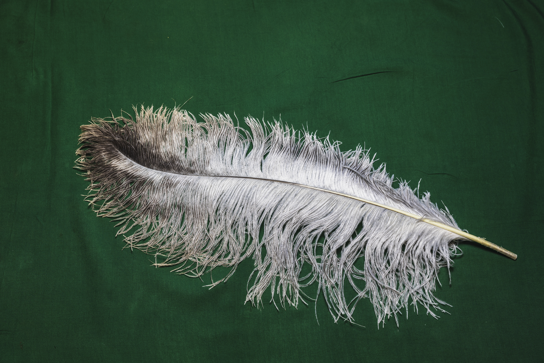 Ausgesuchte Federn mit sehr langen, schönen Fransen. Große Feder in naturbelassener Farbe.